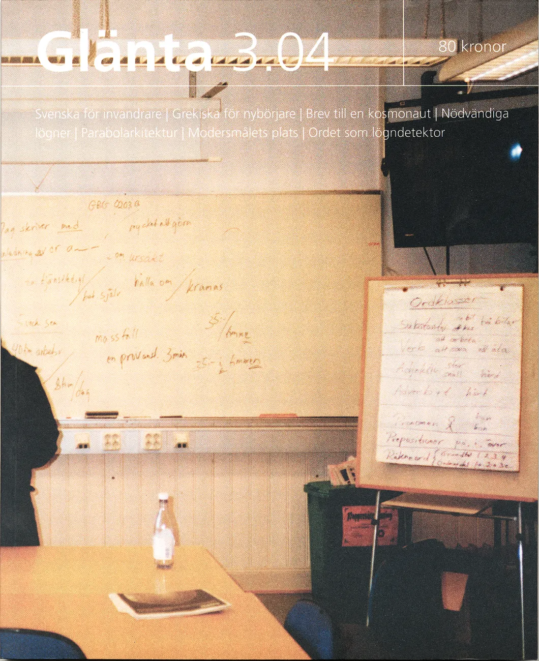 This issue of the Swedish culture & philosophy magazine is based on Katrin von Maltzahn’s work "Svenska för invandrare". In addition it contains texts by Jacques Derrida, Aris Fioretos, Pilar Zaratiegui Gómez, Patricia Lorenzoni, Caroline Moorehead, Aleksander Motturi, Ulf Karl Olov Nilsson and Malte Persson.