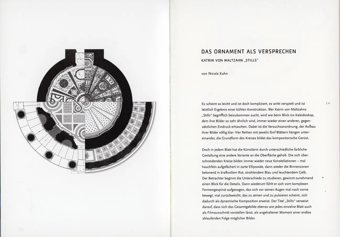 "Hybrid untersucht Überschneidungen zwischen Architektur und Kunst und findet sie beispielsweise in der Geometrie: Der Kreis ist das universale Bild allen Seins; in der Architektur der Renaissance und des Barock bildet er das konstitutive Moment. Einmal erkannt, entdeckte Katrin von Maltzahn den Zirkelschlag überall wieder: in Bodenmosaiken, Wanddekors, Kuppelgestaltungen.
