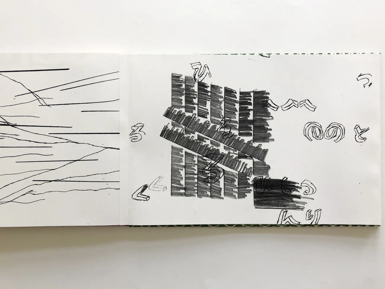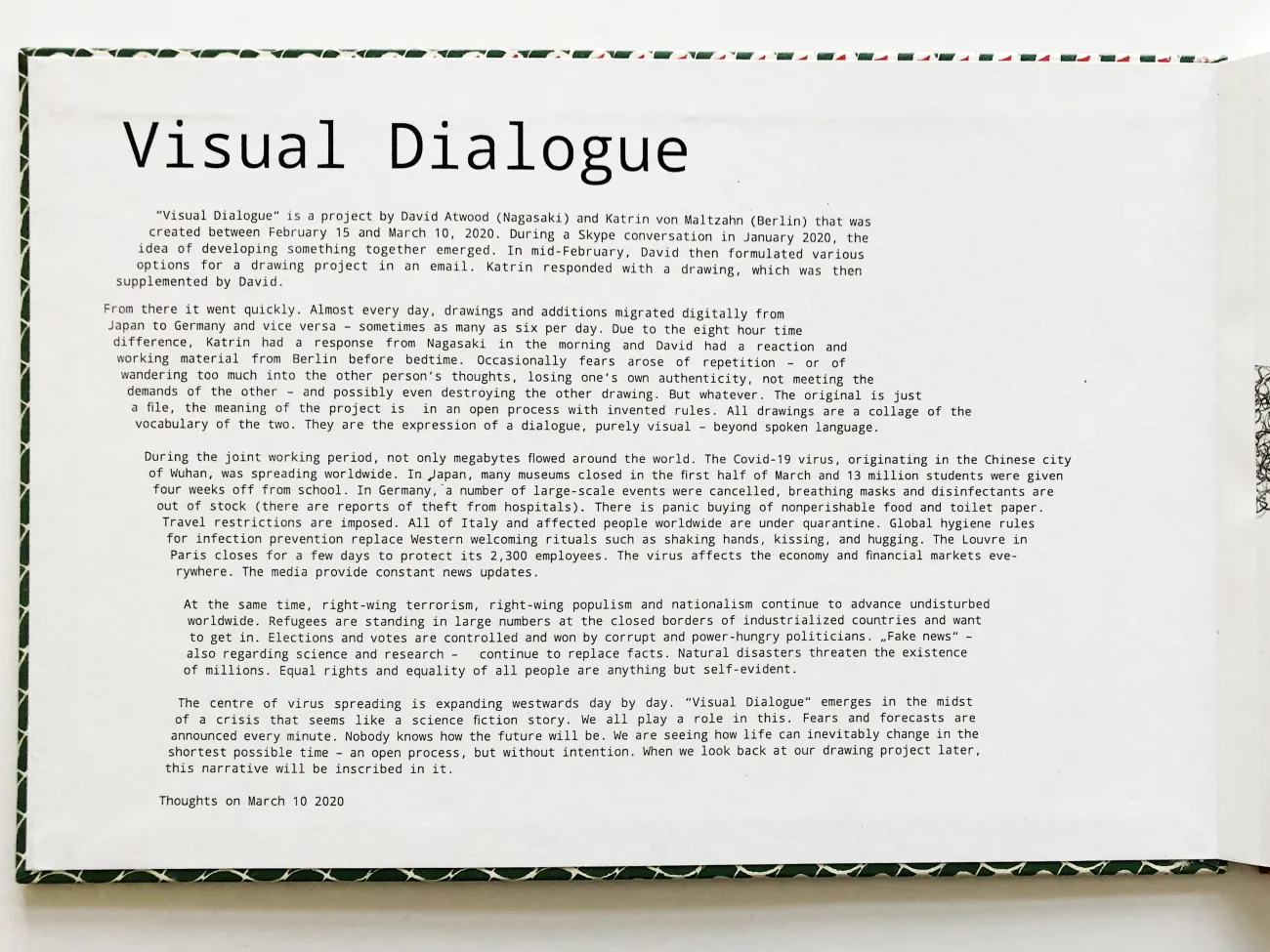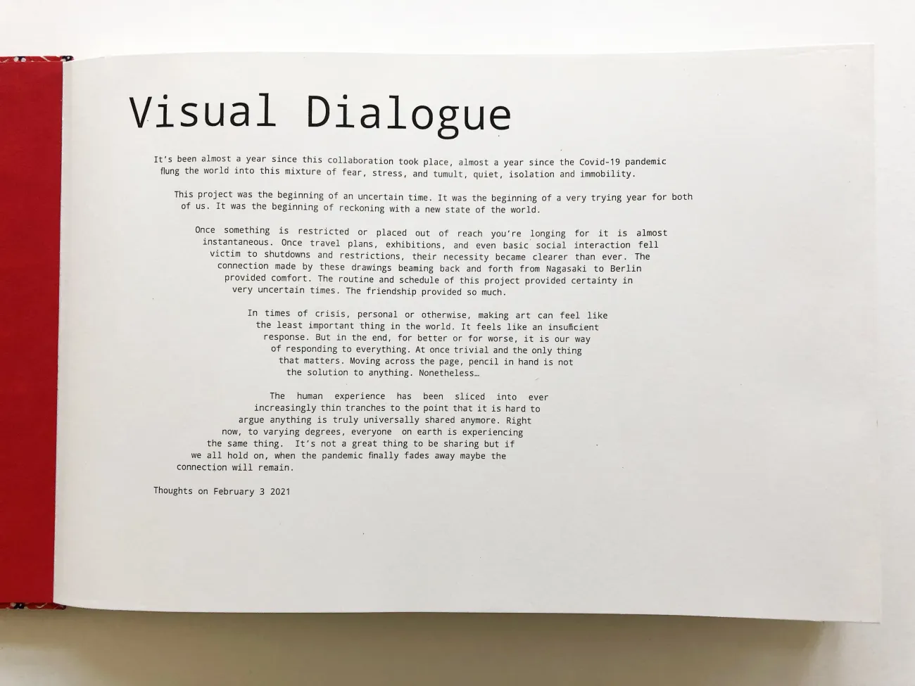 The book is based on 48 collaborative drawings made in February/March 2020 in David's studio in Nagasaki and Katrin's studio in Berlin.