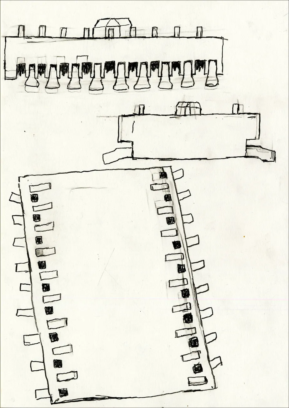 6 Frottages on paper, each 1000 x 140cm, 3 Frottages on paper each 400 x 100cm (charcoal), 6 bronze casts. (edition of 2)