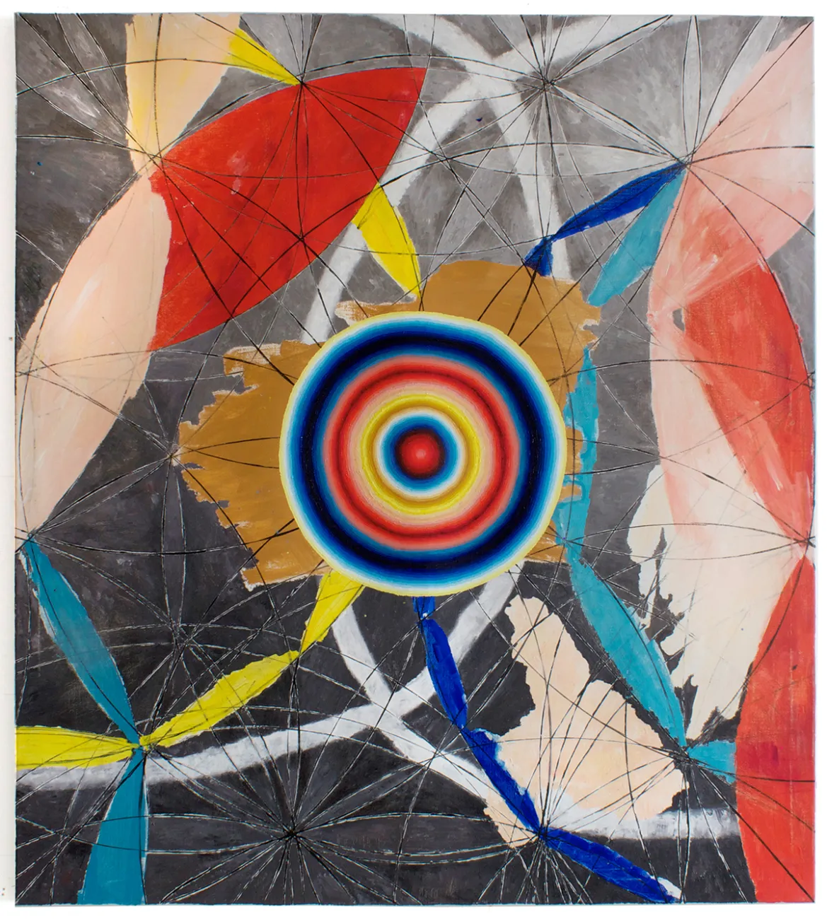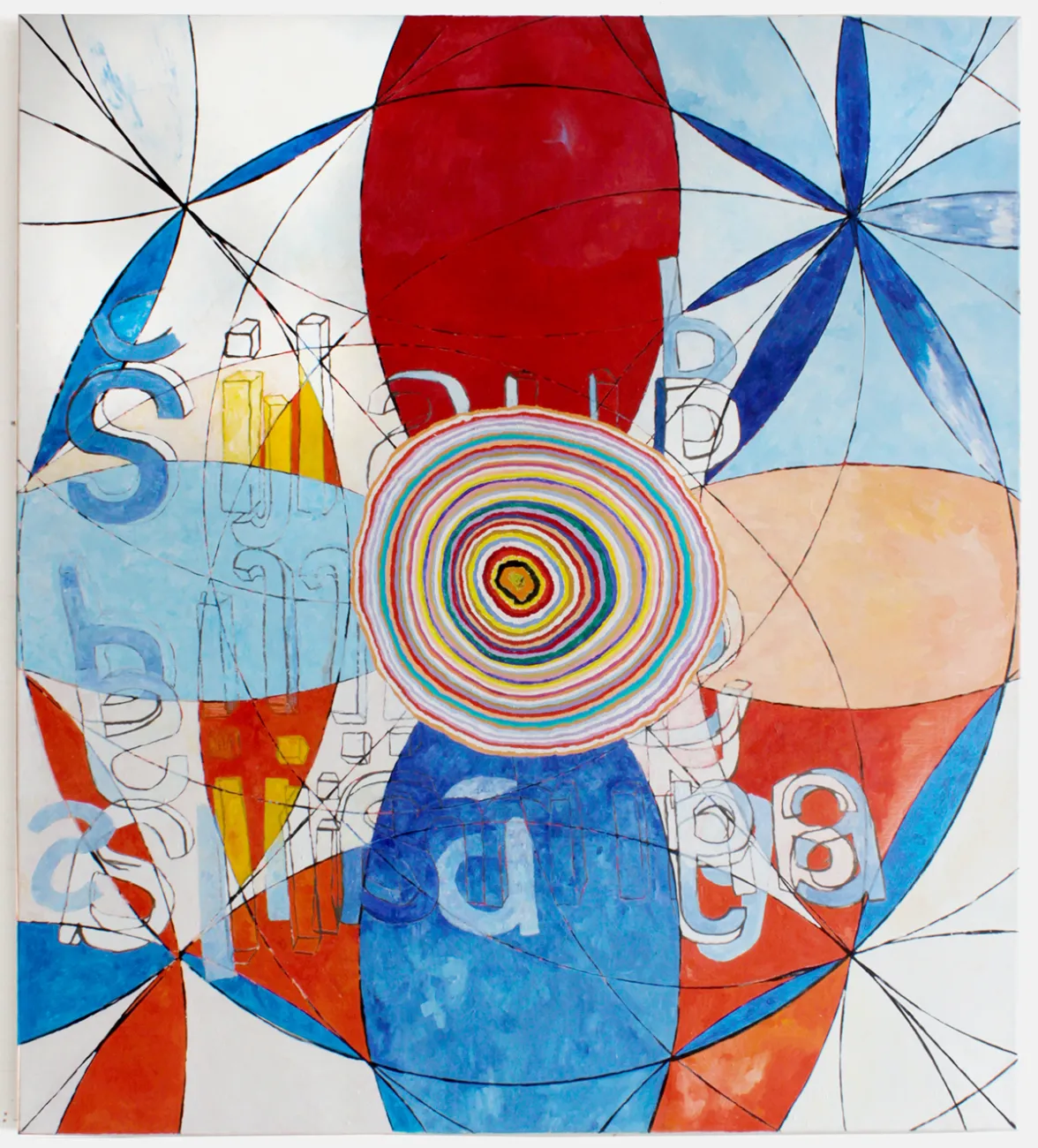I’m fascinated by systems in geometry, language, signs, and diagrams. In these three paintings I freely applied elements of it to my canvases – using brushes and compasses. They are arranged to generate a visual life of their own.