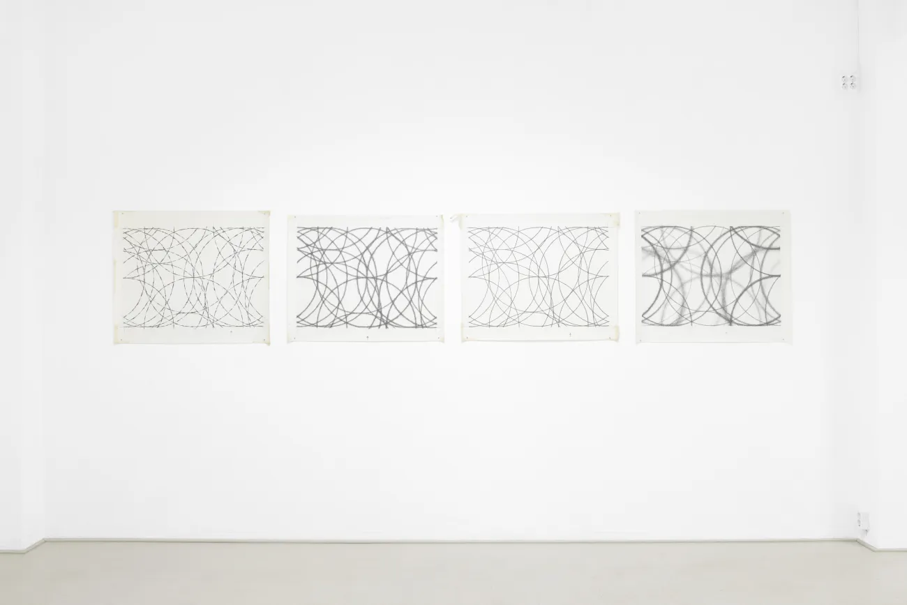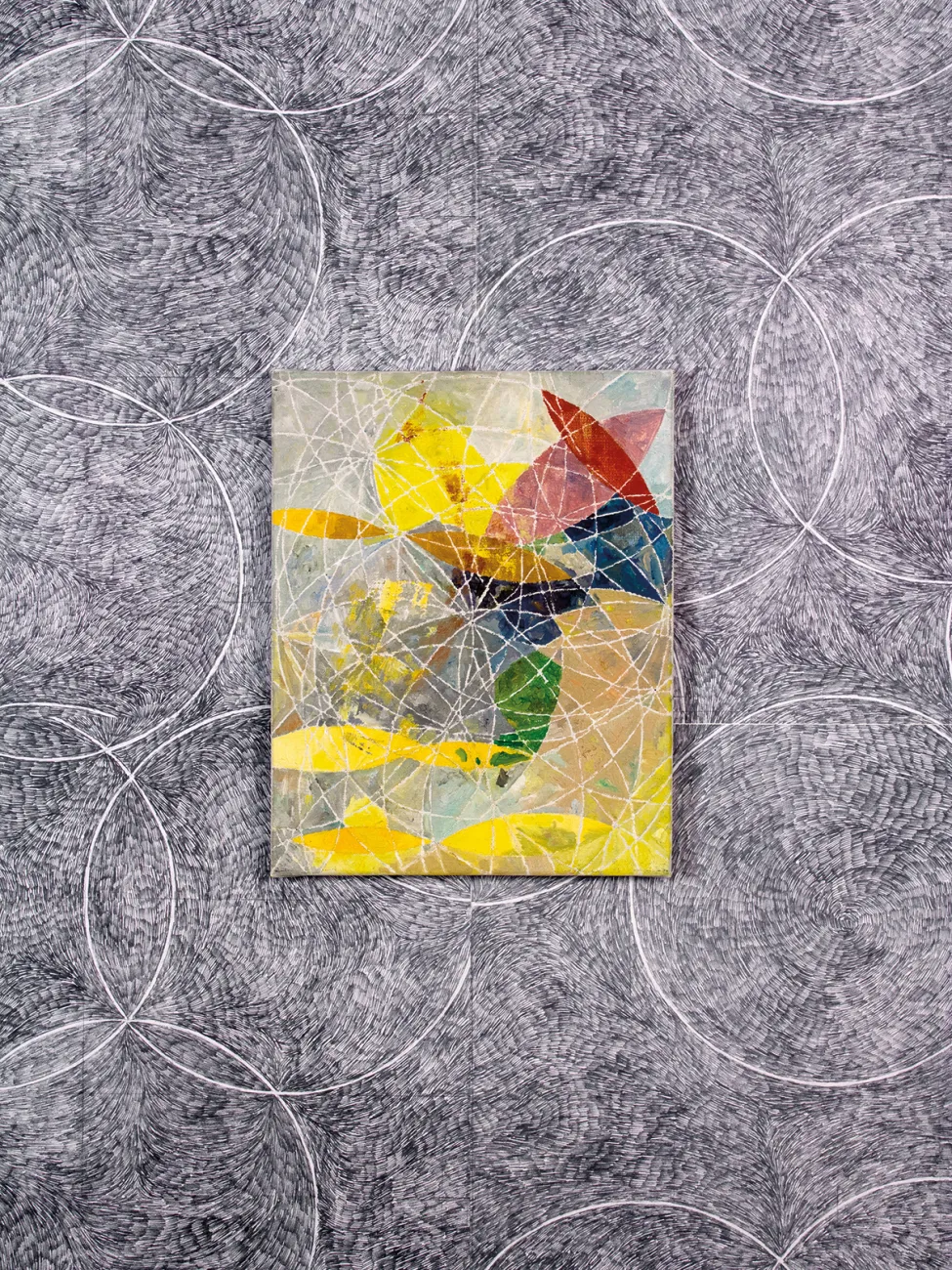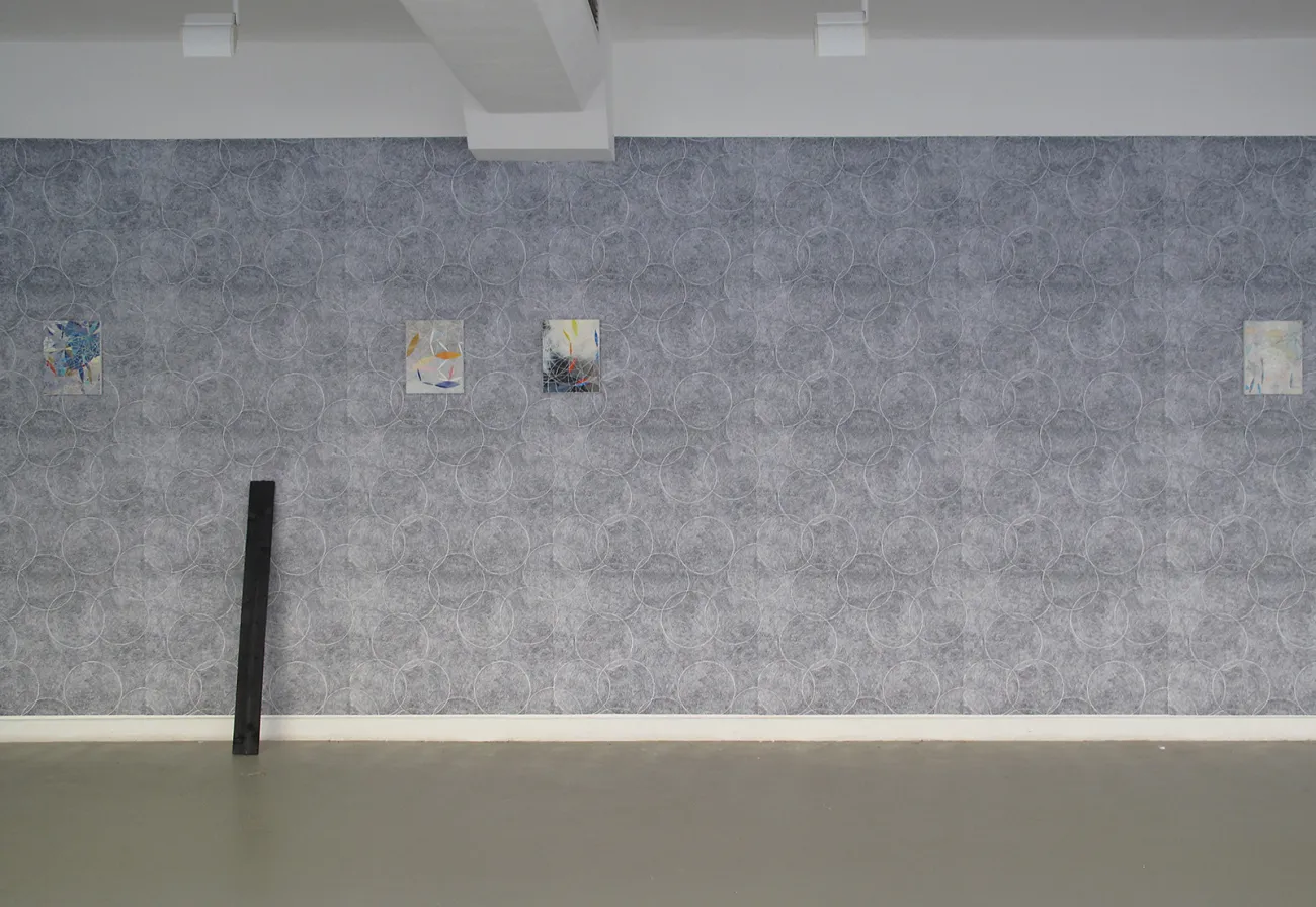The Radar-paintings sometimes become part of an installation. They are then installed on top of offset prints, featuring a circular motif, based on a pencil drawing.