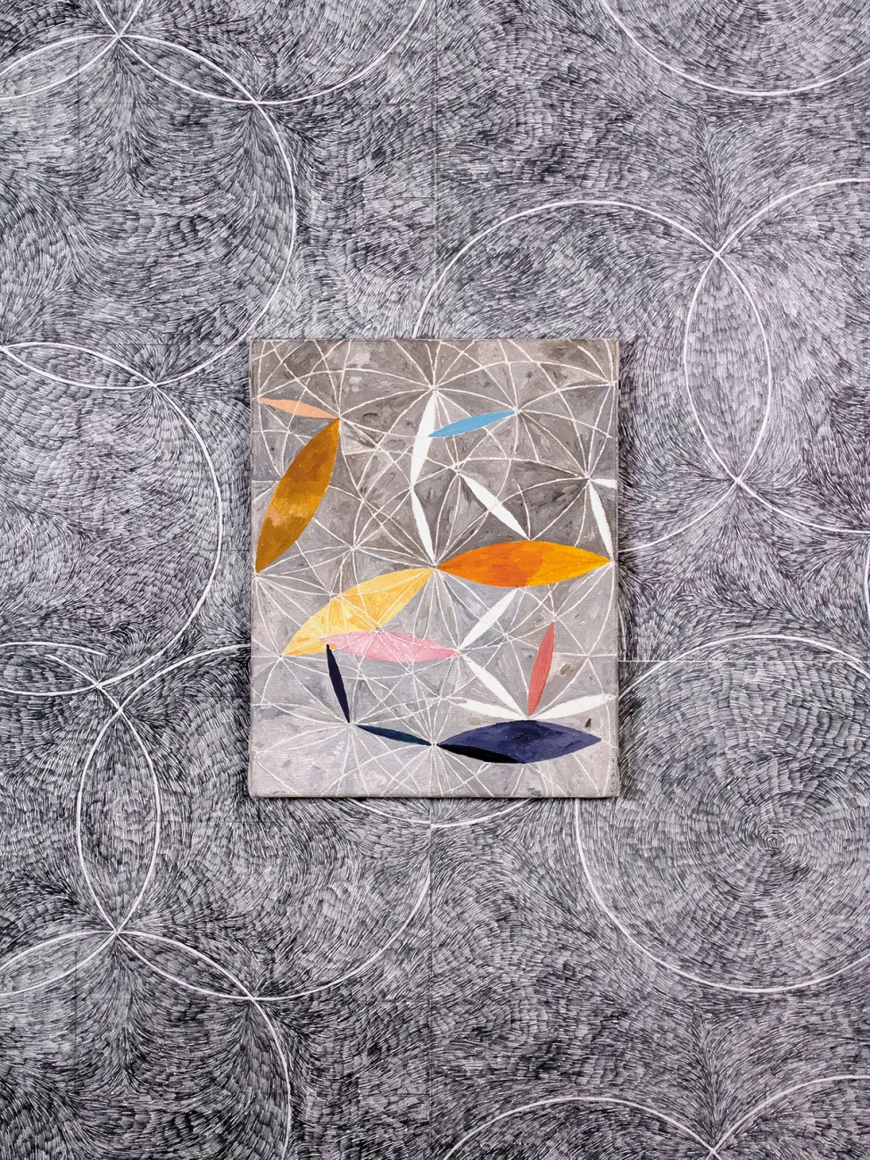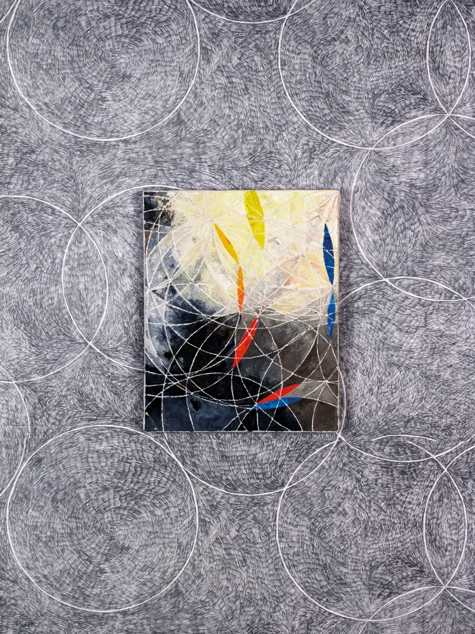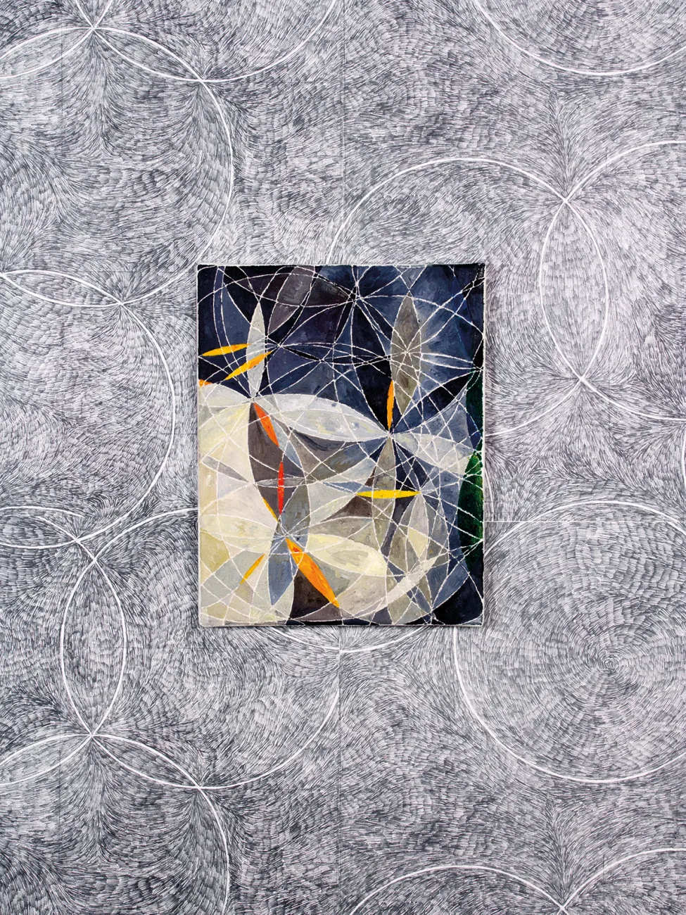 The Radar-paintings sometimes become part of an installation. They are then installed on top of offset prints, featuring a circular motif, based on a pencil drawing.